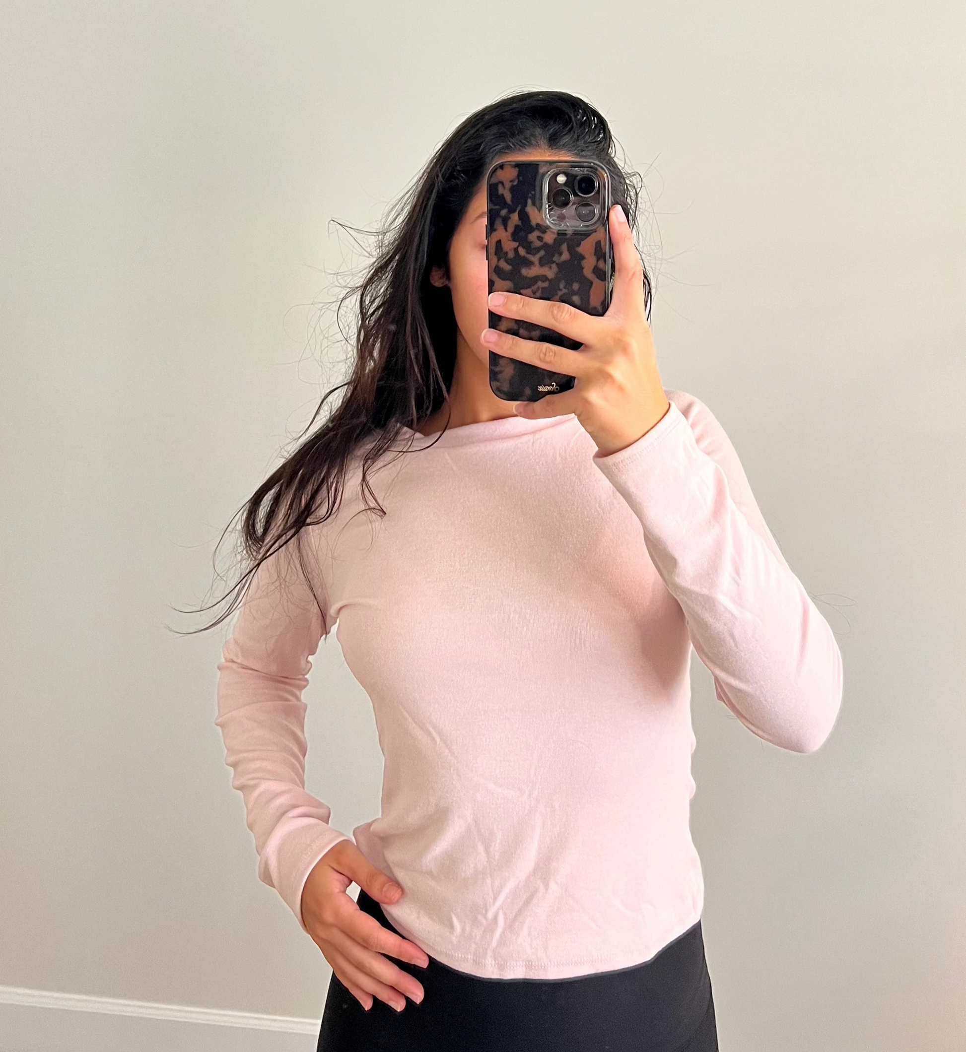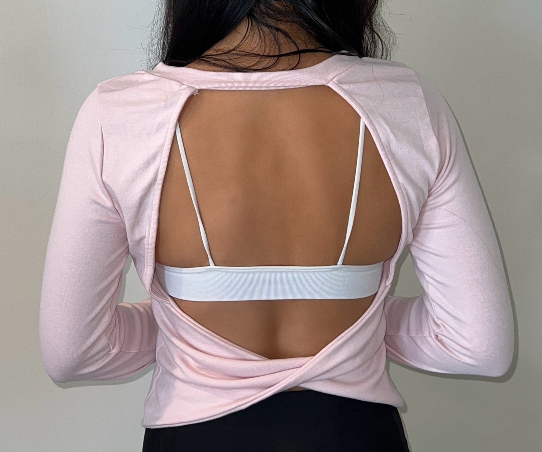 Add a soft, feminine touch to your wardrobe with the Ballerina Top. It includes a cut-out back in a beautiful baby pink color. Featuring long sleeves and a slightly cropped fit, this top blends comfort with a playful, trendy design. The highlight is the stylish back cut-out with a loop button closure, offering a modern twist to the classic knit.
