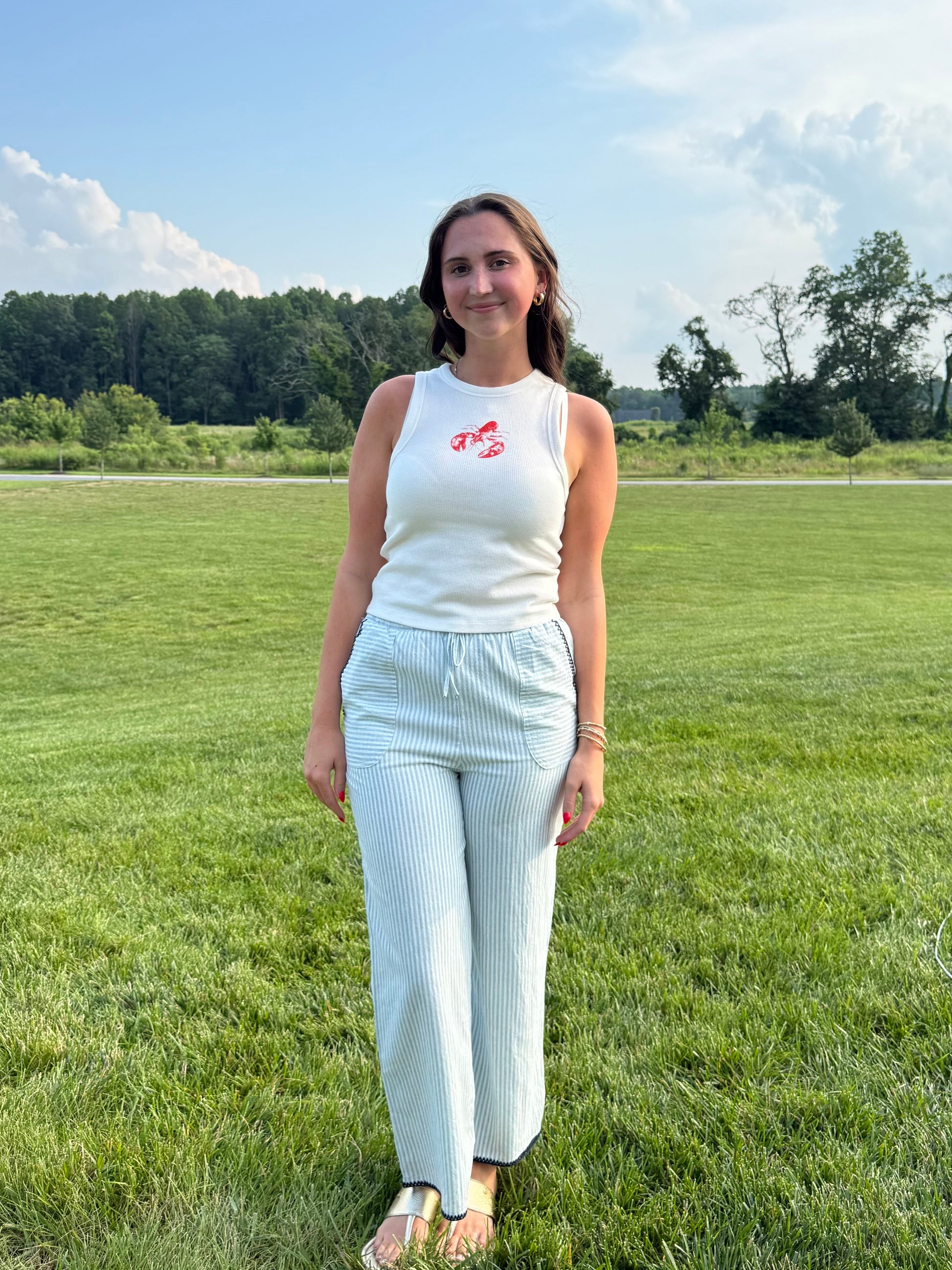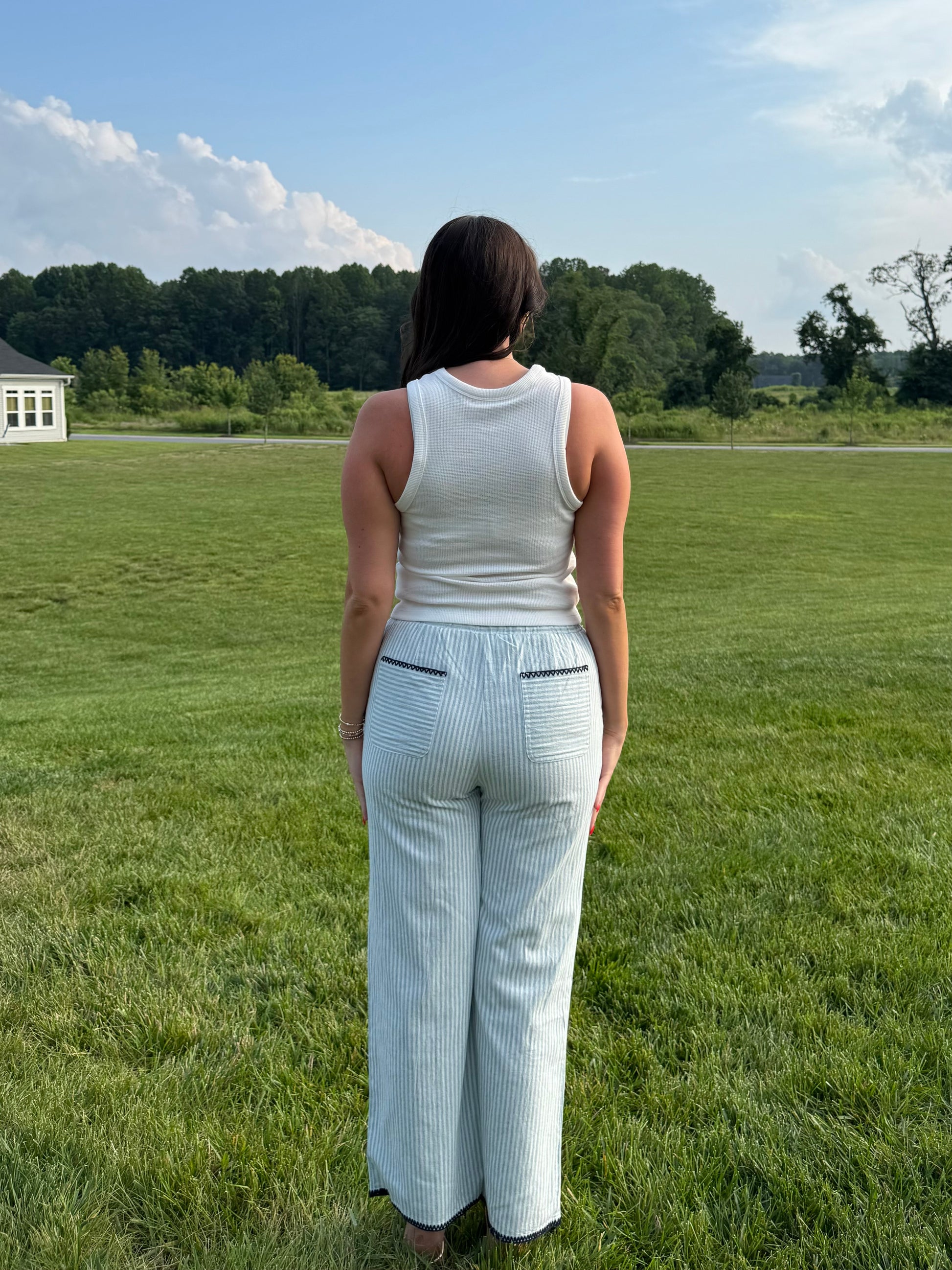 The Beach Babe Striped Pants feature bold stripes and contrast trim accents. The stitching adds a unique, stylish touch, perfect for elevating casual or semi-formal looks. Comfortable and trendy with a tailored fit.
