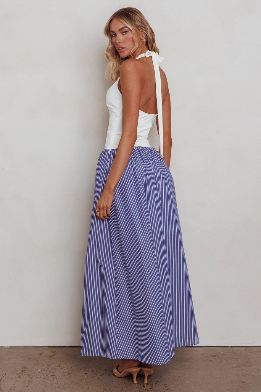 Sail through sunny days in the Boat Day Maxi Dress — a breezy, chic staple with a halter neck, open back, and flowing striped skirt for effortless nautical style.