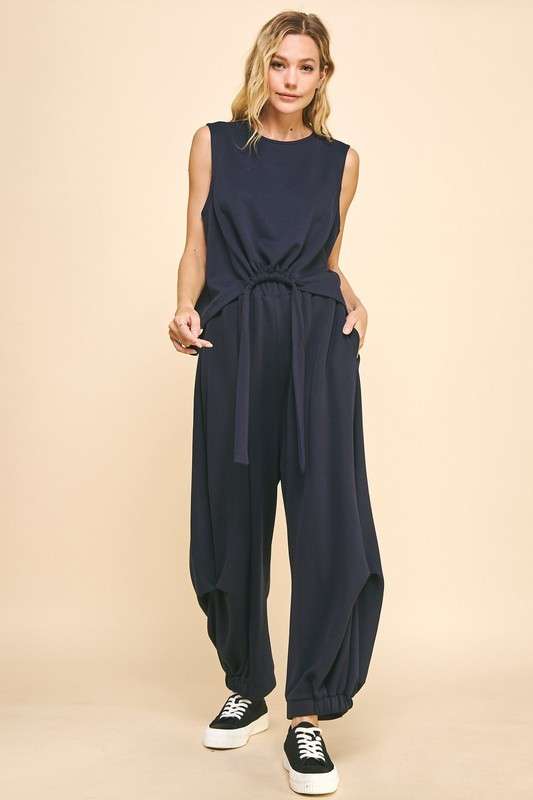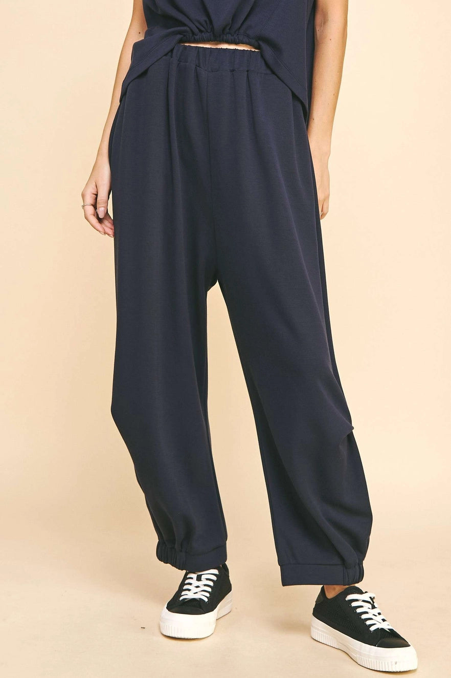 The Easy Living Lounge Set offers ultimate comfort and effortless style for lounging or casual days at home. The top features a relaxed fit with a solid crew neck, capped sleeves, and a flattering round bottom hem, complete with a cinch tie detail that lets you adjust the fit to your preference. The matching pants are designed with an elastic waist and banded hem for a secure yet comfortable fit, while the semi-harem cut provides a relaxed, modern silhouette. Whether you're relaxing on the couch or running errands, this lounge set brings the perfect balance of cozy and chic.