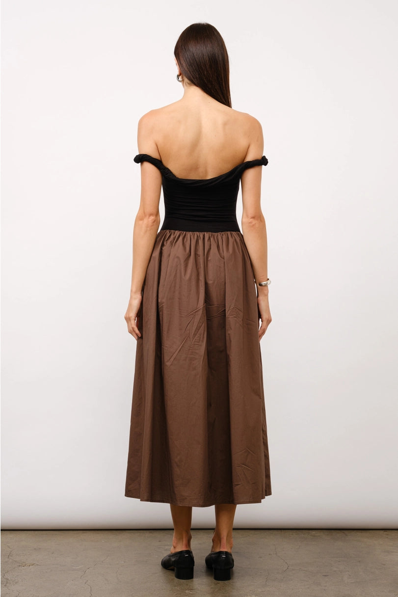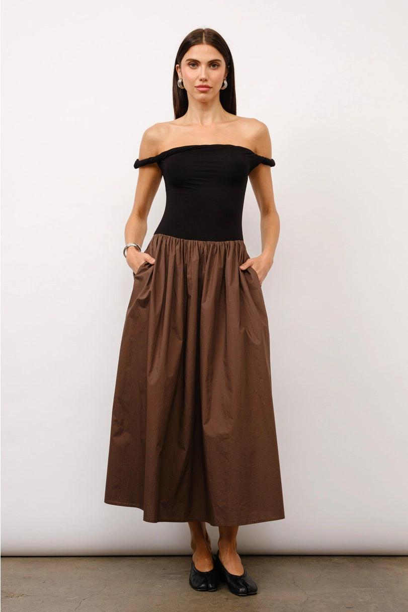 The Ella Mixed Media Maxi Dress is a stunning fusion of modern design and classic elegance. This mix-media dress features off-the-shoulder twisted straps that add a chic, stylish twist to a timeless silhouette. The fitted bodice contrasts beautifully with the flowing, full brown colored maxi skirt, creating a flattering shape that moves gracefully with every step.