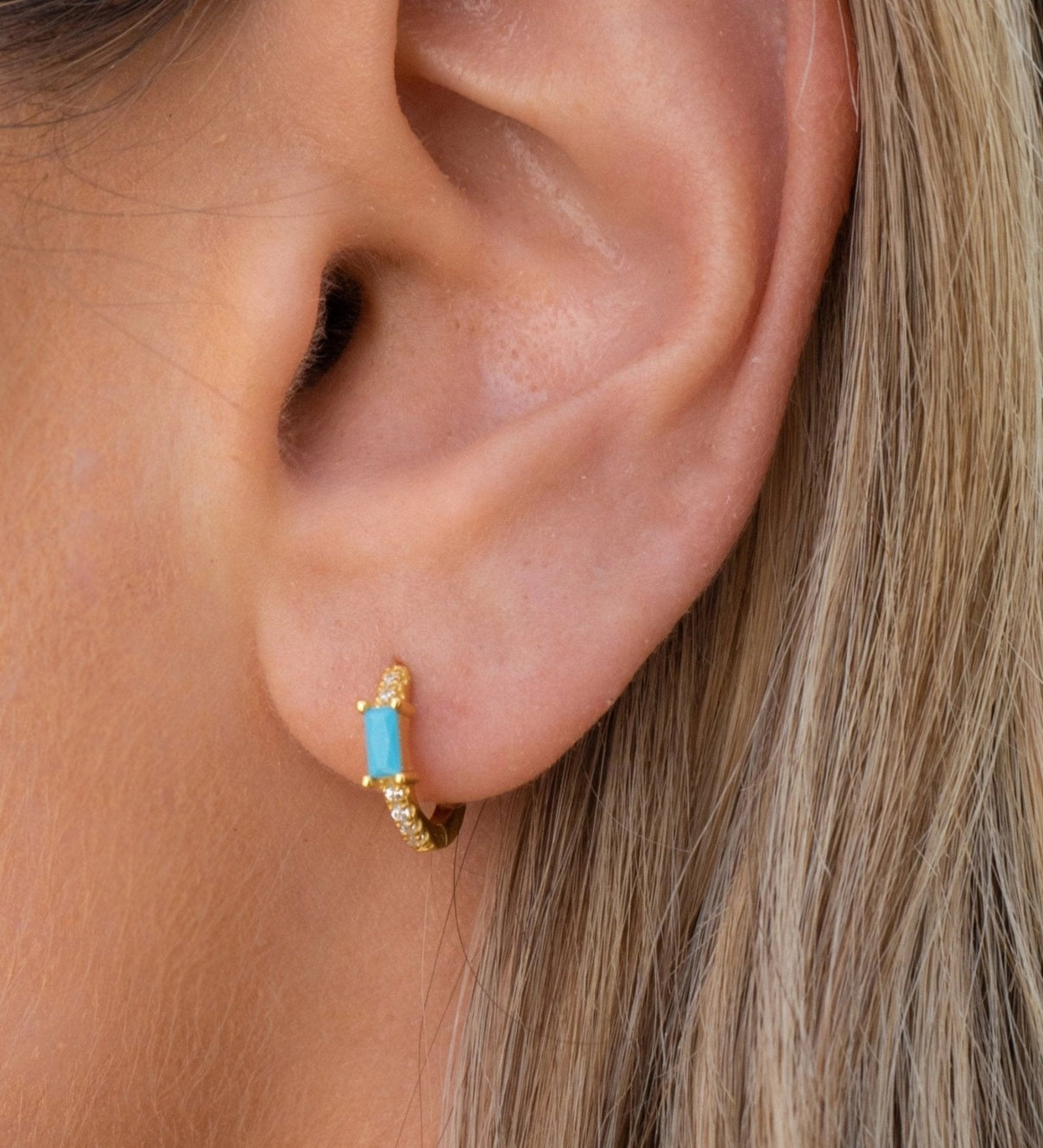 The Jane Huggies are a turquoise crystal baguette huggie earring made of vermeil.