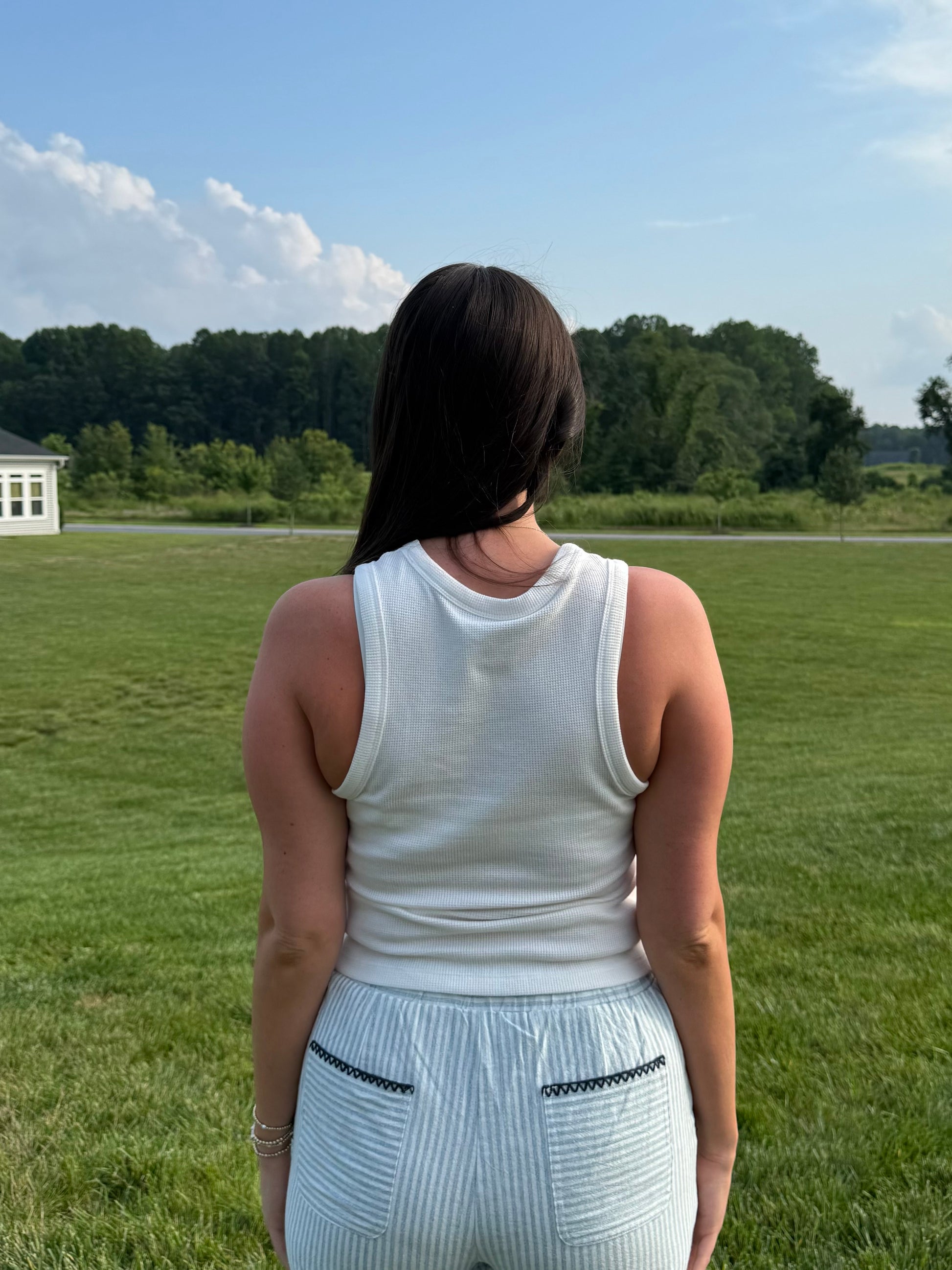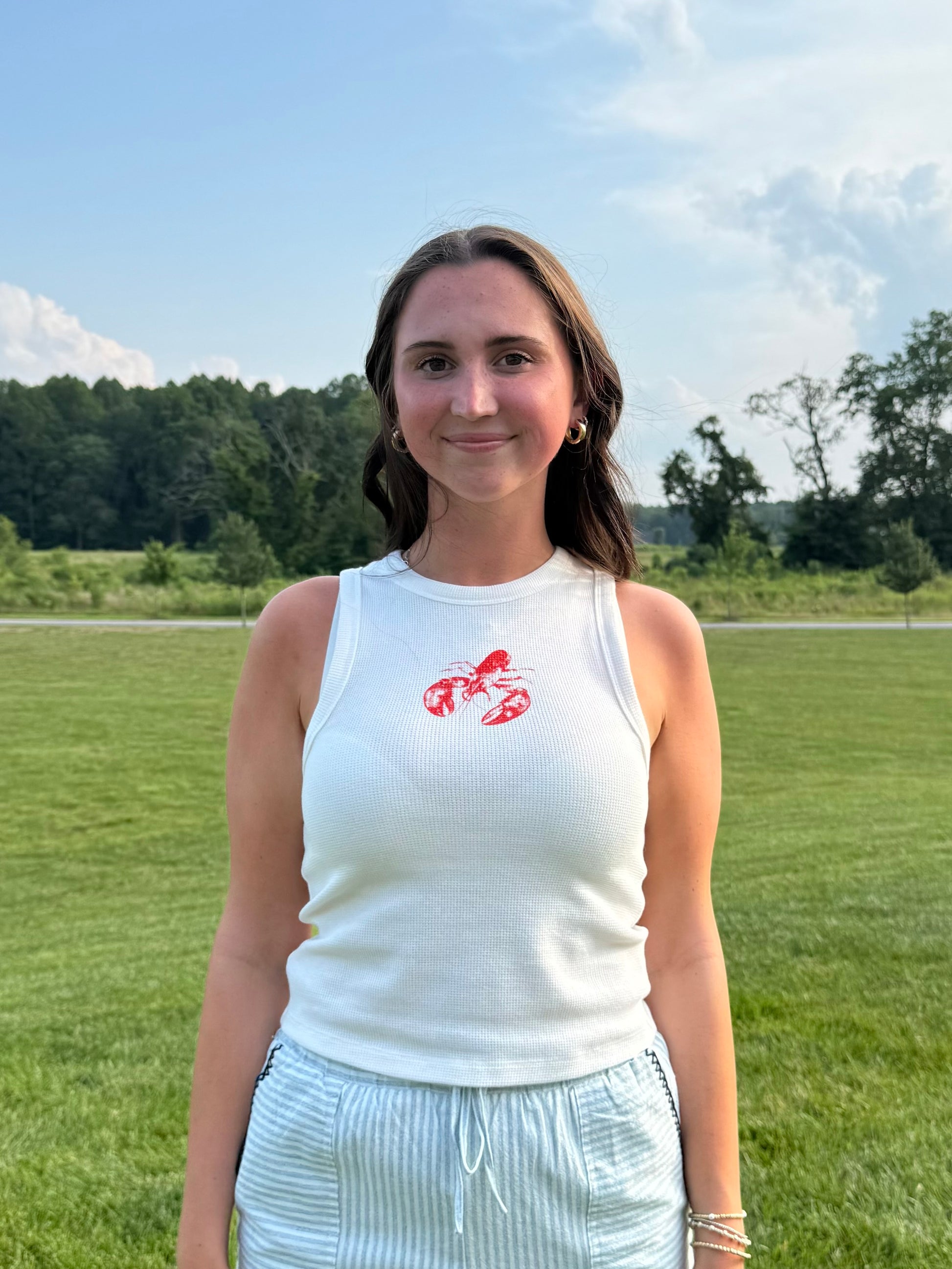 A soft, waffle-knit thermal tank top featuring a vintage-style lobster graphic. Designed with a round neckline, sleeveless cut, and racerback style for a laid-back look. It offers a relaxed fit for everyday comfort.