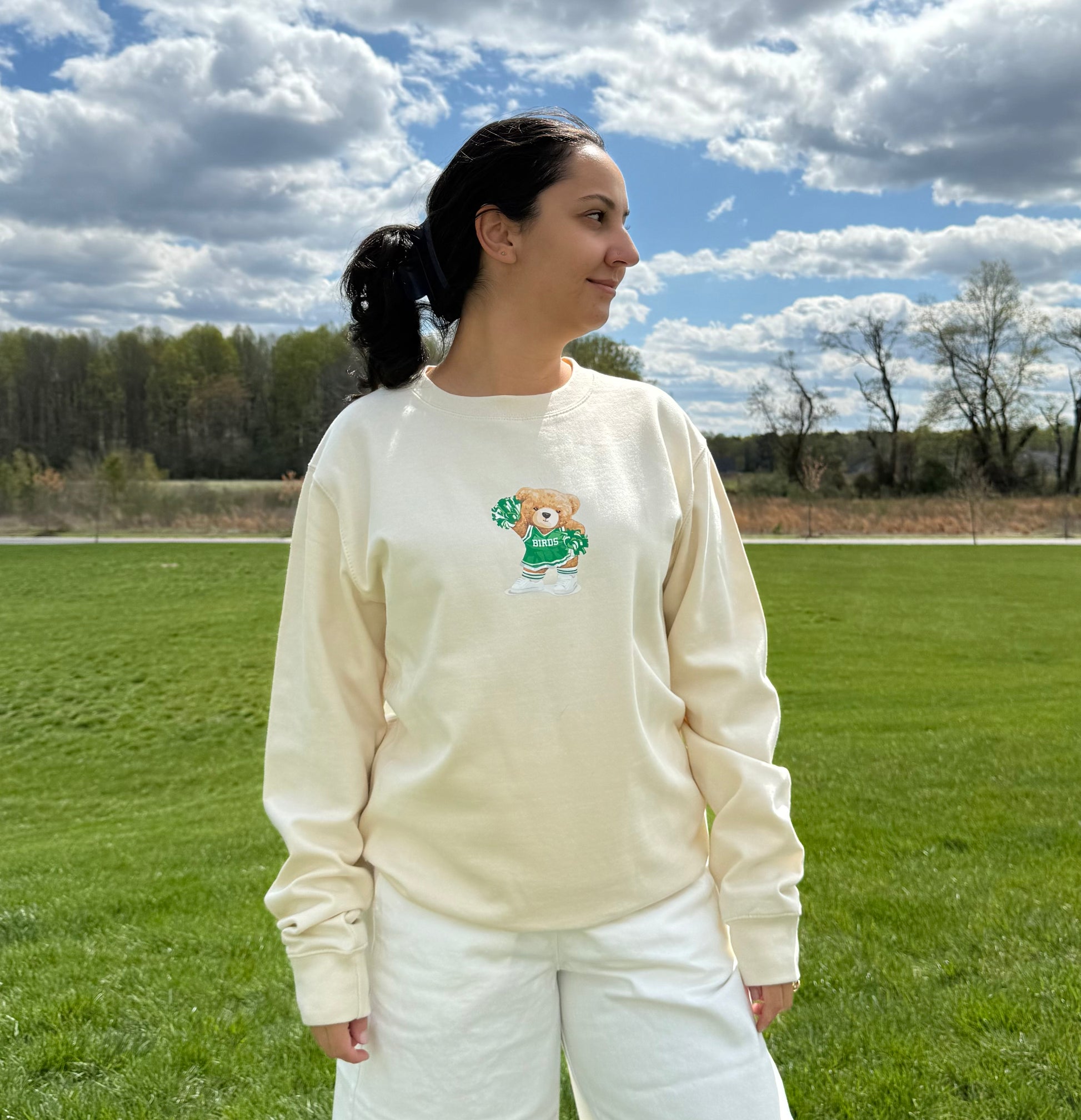 This cozy sweatshirt features an adorable cheerleader teddy bear dressed in a green and white Eagles cheering uniform, complete with pom-poms to show off your team spirit! The minimalist yet playful design makes it perfect for game days, lounging, or casual outings.