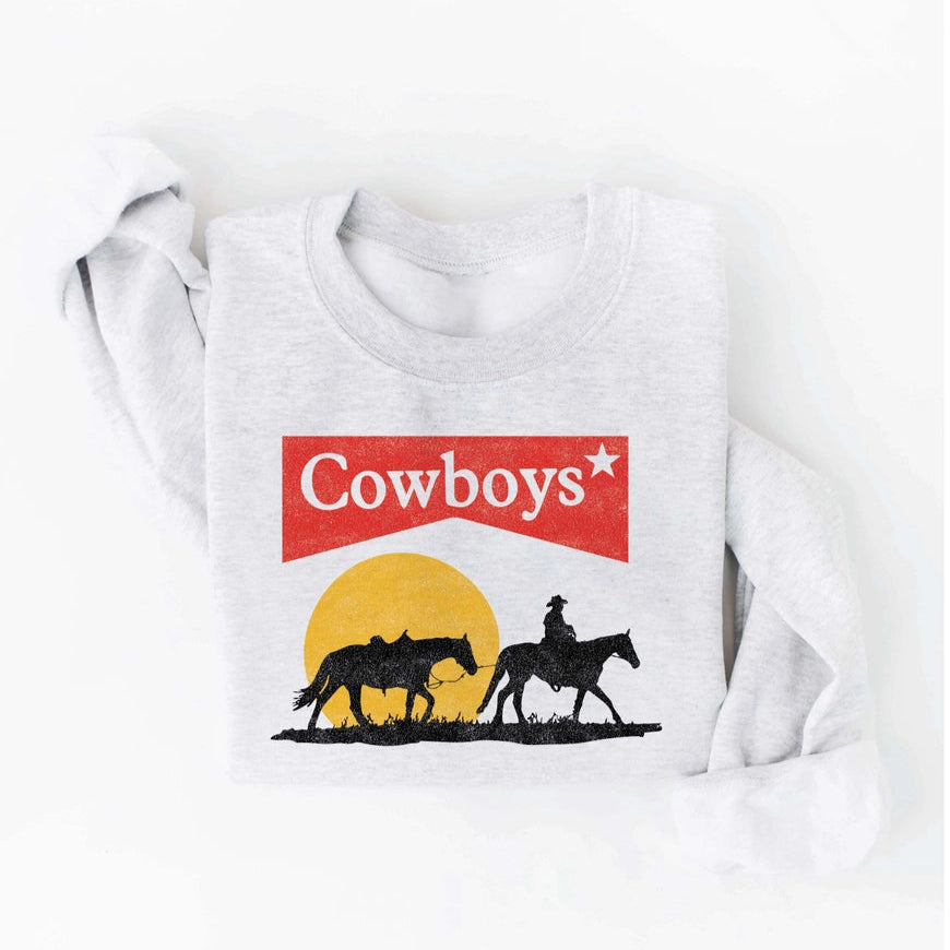 The Sunset Ride Crewneck captures the spirit of the open range with a striking design featuring a cowboy riding off into the horizon, framed by a vibrant sunset. Crafted for comfort, this cozy crewneck keeps you warm while letting you showcase your love for the wild west in style. Perfect for a laid-back day!